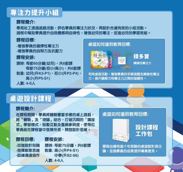 認識及體驗不同類型桌遊的玩法,訓練學員邏輯推理、解難能力、耐性及洞察力。透過討論過程作出正確判斷,找出對自己有利的一步,學習減低犯錯,訓練耐性,掌握遊戲中的策略思維與技巧。